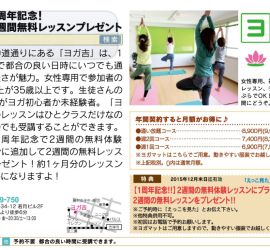 吉祥寺ECCO!に紹介されました!This entry was posted in ニュース on 2015年12月11日 by ksenta0518 吉祥寺のお得な情報満載の情報誌「吉祥寺ECCO!」にヨガ吉が紹介されています。 1周年記念のお得な2週間の無料 […]