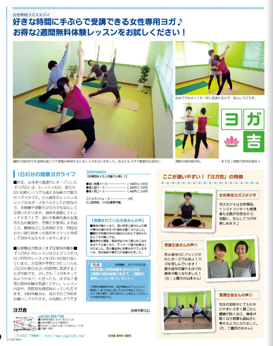 ぱどに掲載されましたThis entry was posted in ニュース on 2015年2月26日 by yogakichi 今日発行のぱどに「ヨガ吉」がなんと一面で掲載されています。武蔵野市や三鷹市のご家庭に配布されていますので、是非ご覧になってくださいね。