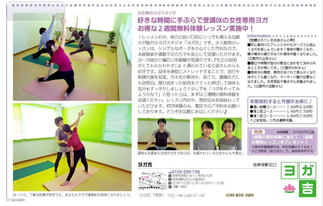 ぱどの4月24日号にヨガ吉が載ってます!This entry was posted in ニュース on 2015年4月23日 by yogakichi 4月24日発行のフリーペーパー ぱどの三鷹・武蔵野版にヨガ吉が載っています。 生徒さんの声も掲載されています。 是非ご覧下さい。