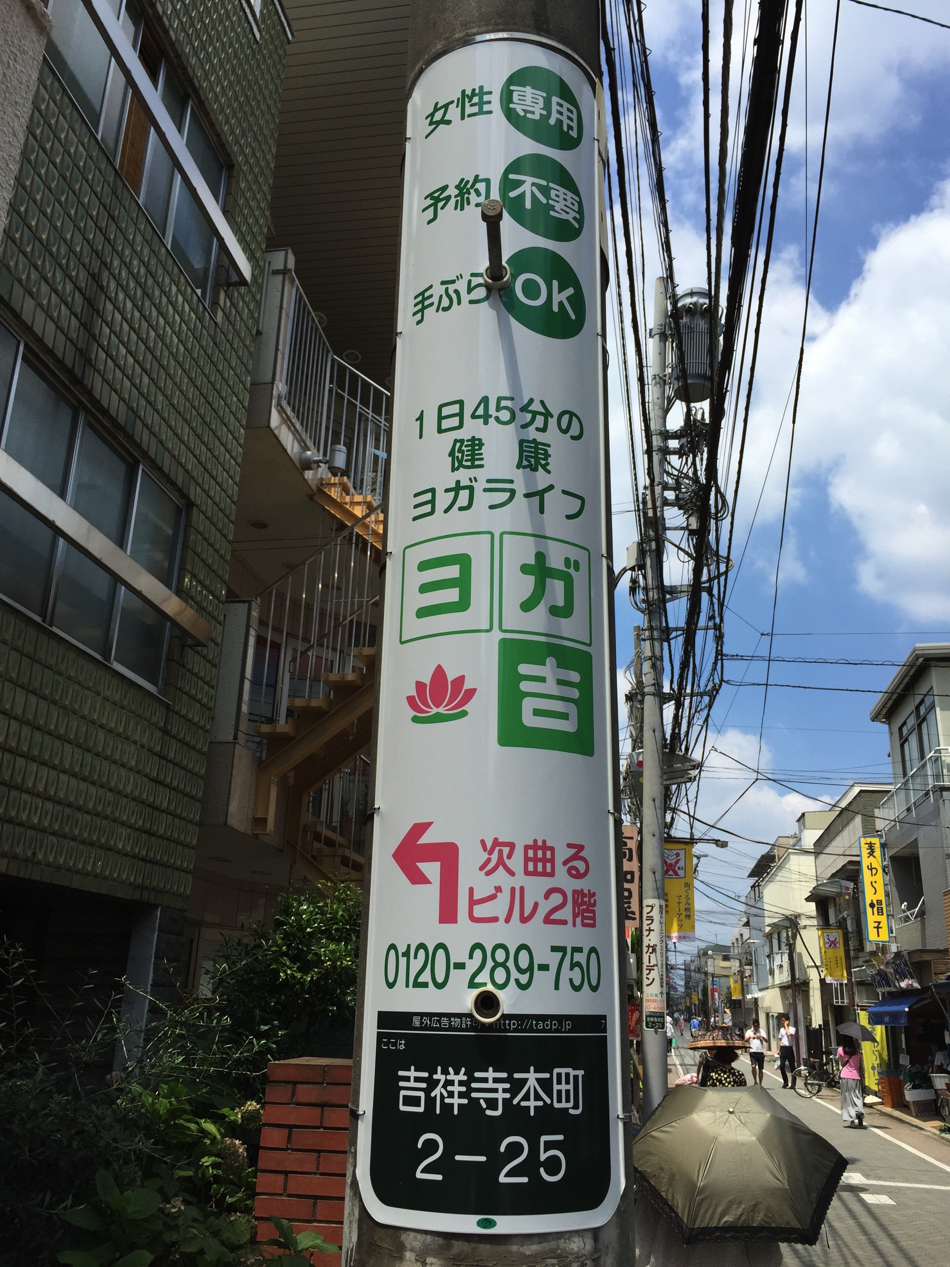吉祥寺の中道通りを歩かれている方はもうご存じかもしれませんが、7月から中道通りの電柱にヨガ吉の看板が登場しました。