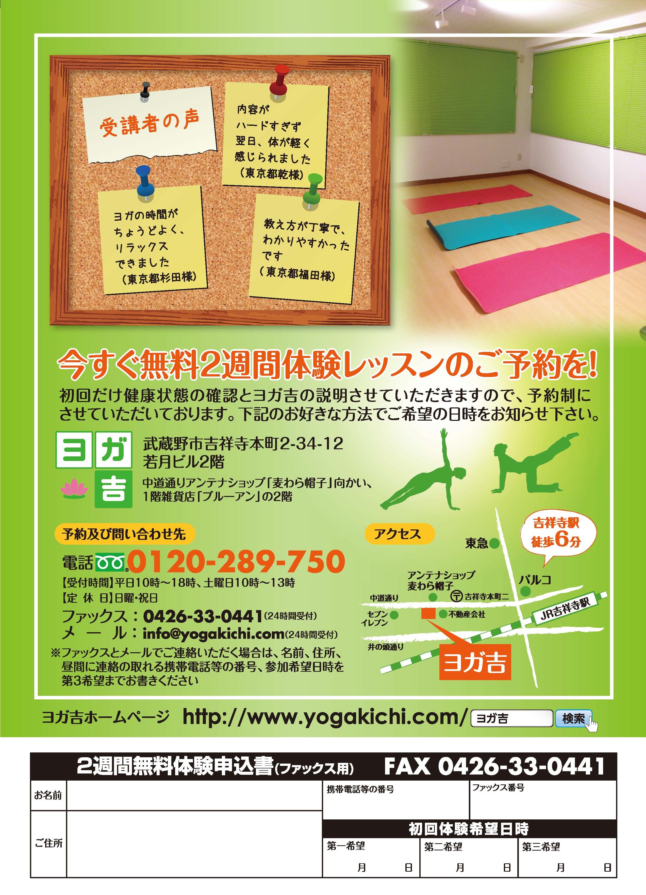 今日、ヨガ吉オープンします!This entry was posted in ニュース on 2014年9月30日 by yogakichi みなさん、おはようございます。 今日もいい天気、「ヨガ吉」日和です。 今日から「ヨガ吉」オープンします。 ドキドキワクワクの朝です。 一部の地域の皆様には、今朝の朝刊に折り込み広告を配布させていただきました。 配布されなかった地域の方のために、ここに掲載させていただきます。 クリックしていただけるとチラシが大きくなってご覧いただけます。 みなさんとお会いできる日を楽しみにしています。
