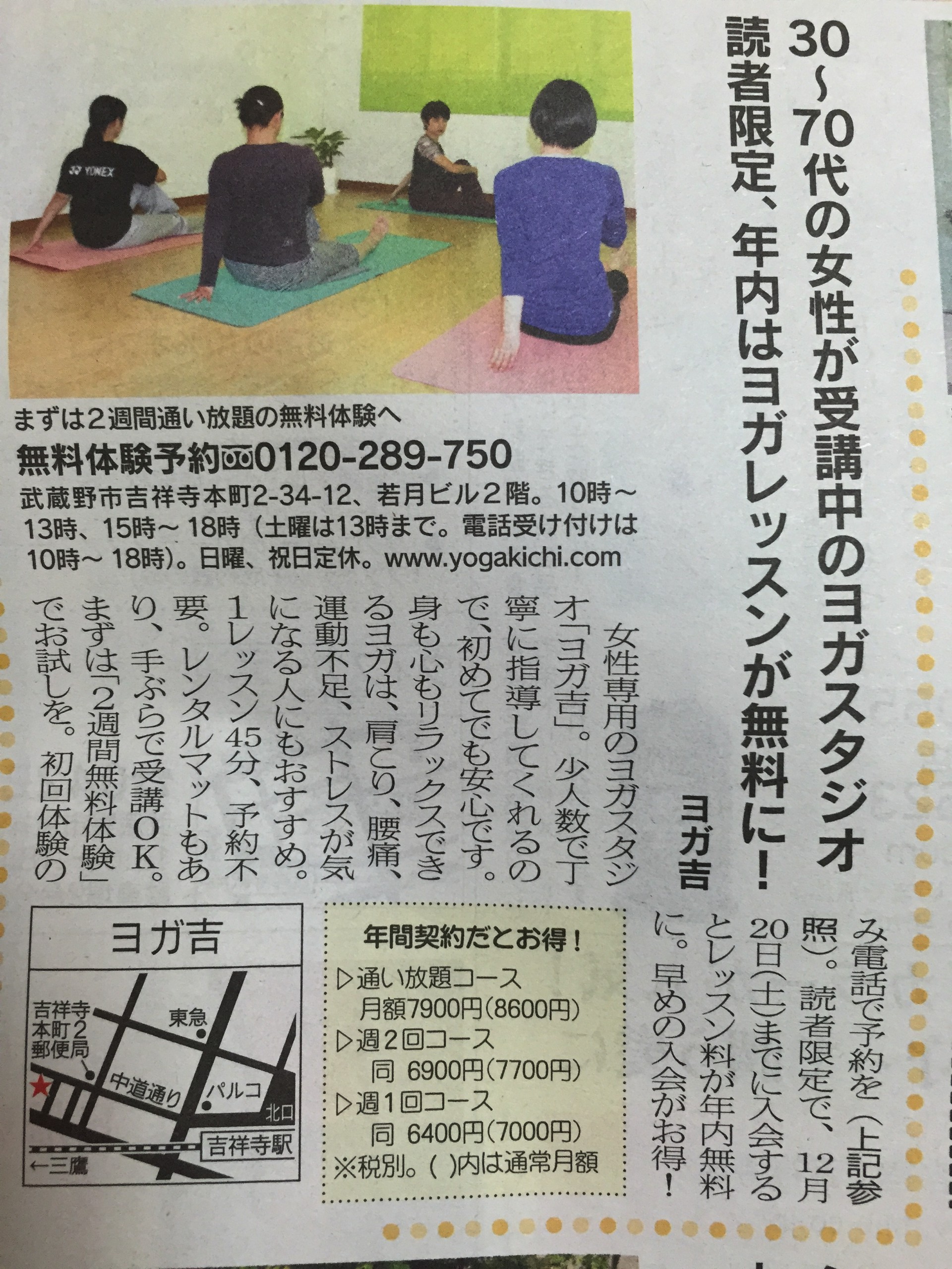 リビングむさしのに吉祥寺のヨガスタジオ ヨガ吉が掲載されましたThis entry was posted in ニュース on 2014年11月21日 by yogakichi 昨日と今日、配布されました「リビングむさしの」11月22日号にヨガ吉が掲載されました。 読者限定の特典もありますので、初回体験時に「リビングむさしの」を見たと言ってくださいね。 みなさんとお会いできるのを楽しみにしています。